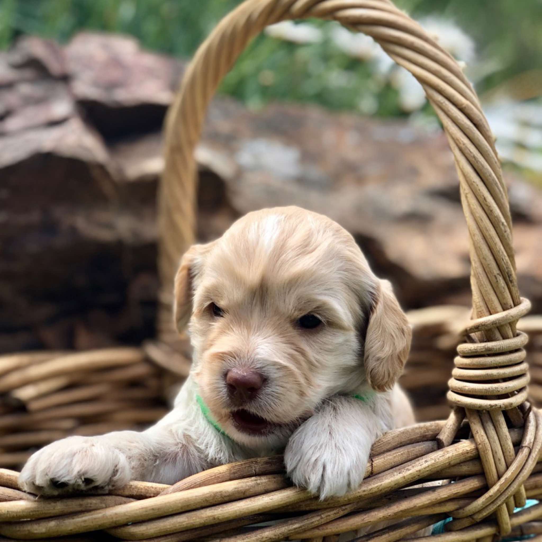 Green Collar Girl, Cremé Caramel Colour, White Snip on Forehead, Fleece Coat , Miniature Size.