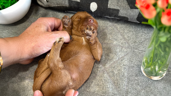 Burrinjuck Harriet is dressed in a spectacular shade of red. She will have a dark chocolate nose and therefore is termed caramel. She also has a modest line of white on her chest. This auburn beauty will have a luxurious, silky, fleece type coat. A fleece coat is minimal to non-shedding with a soft curl.