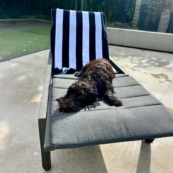 During the day, she’s my shadow, following me around and sleeping at my feet. But every day around 4pm she brings me her rubber ball and pleads to go to the park. Lullaby prefers to play with humans and will chase and retrieve her ball (and only her ball) for hours. She likes to involve everyone in the game and will drop her ball and gently tap your leg if she wants you to play. Lullaby is also a water baby and loves baths and spending hot summer afternoons in the pool with the kids (especially if they throw her ball in the water for her to fetch).