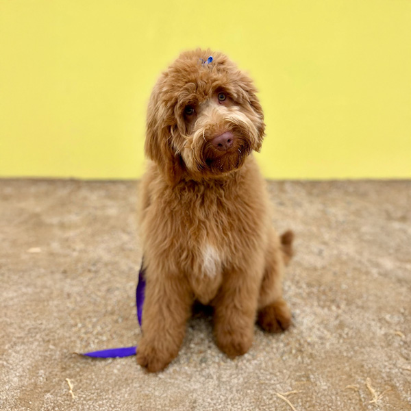 Burrinjuck Victoria is dressed in a spectacular shade of red. Technically because she has a chocolate nose, we refer to her colour as caramel. She also has a cute splash of white on her chest. This auburn beauty will have a luxurious, silky, fleece type coat. A fleece coat is minimal to non-shedding with a soft curl.