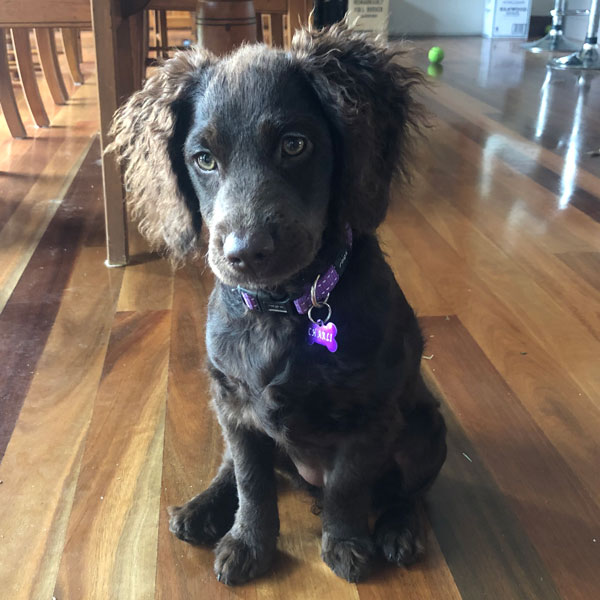 Occasionally labradoodle genetics combine to create individual puppies that have an open face. In this variation, puppies will not develop the long hair around the face that is normally associated with a labradoodle's appearance. Labradoodles with an open face variant are often mistaken for a Curly Coated Retrievers. Puppies with an open face are appealing to the heart as one can clearly view those soulful puppy dog eyes without the obstruction of facial floof.
