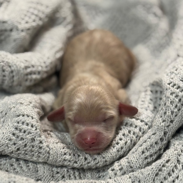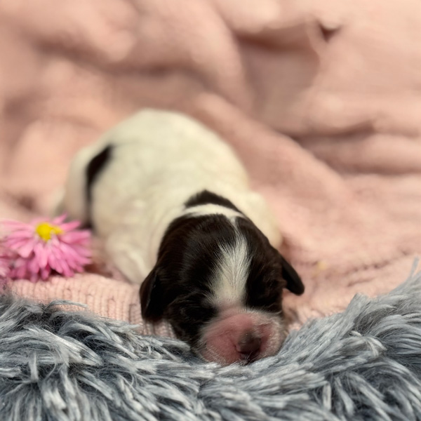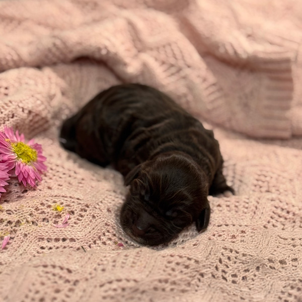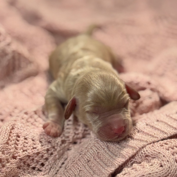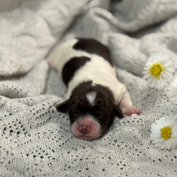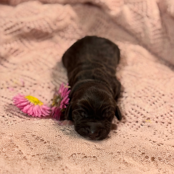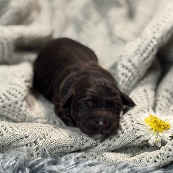 What a terrific way to round up a fantastic year with this exciting litter. Lullaby and Gatsby are both multigenerational, Australian Labradoodles from some of our best blood lines. Born on the due date, with little fuss or fanfare, 7 adorable babies were welcomed into the world on the 10/11/2025. I adore the variety of colours and markings in this litter. They seemed to arrive in pairs after the first spectacular chocolate abstract girl graced us with her presence at around 7.30am this morning. Two creme caramel puppies, two chocolate parti puppies and two chocolate puppies followed in the line-up.