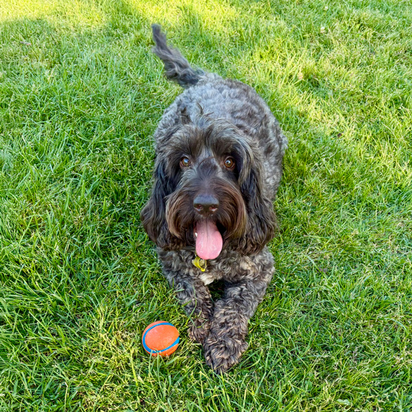 During the day, she’s my shadow, following me around and sleeping at my feet. But every day around 4pm she brings me her rubber ball and pleads to go to the park. Lullaby prefers to play with humans and will chase and retrieve her ball (and only her ball) for hours. She likes to involve everyone in the game and will drop her ball and gently tap your leg if she wants you to play. Lullaby is also a water baby and loves baths and spending hot summer afternoons in the pool with the kids (especially if they throw her ball in the water for her to fetch).